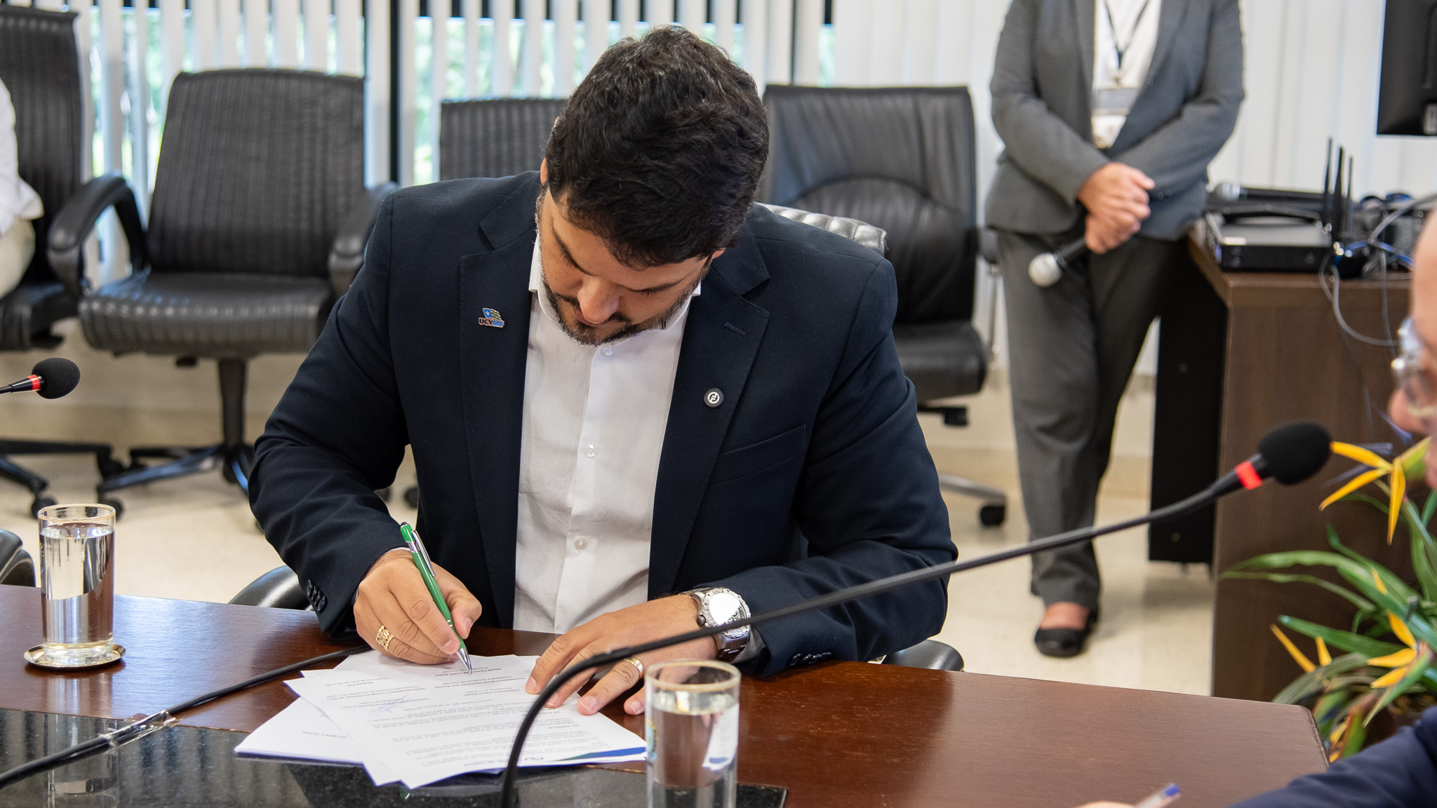 O presidente da UCV-MS, Daniel Teixeira Costa Junior, assinou o termo de adesão ao programa, acompanhado do presidente do TJMS, desembargador Dorival Pavan, da conselheira substituta do TCE-MS, Patrícia Sarmento; da desembargadora Jaceguara Dantas da Silva, coordenadora da Mulher do TJMS; e da diretora da Mulher da UCV-MS, Andrea Fim.